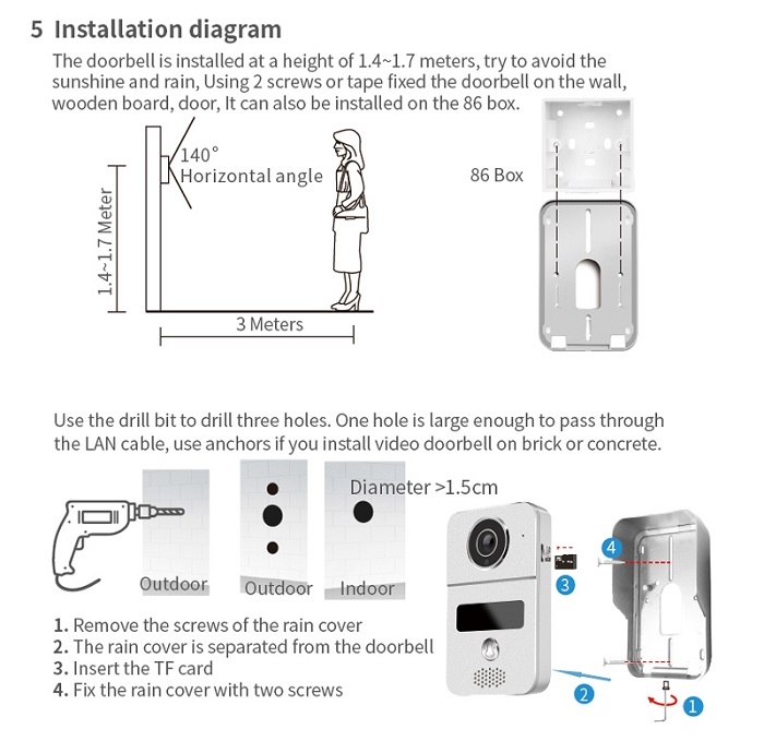 5 .H.265 1080P 2Mega pixles wifi doorbell,150° Horizontal angle
