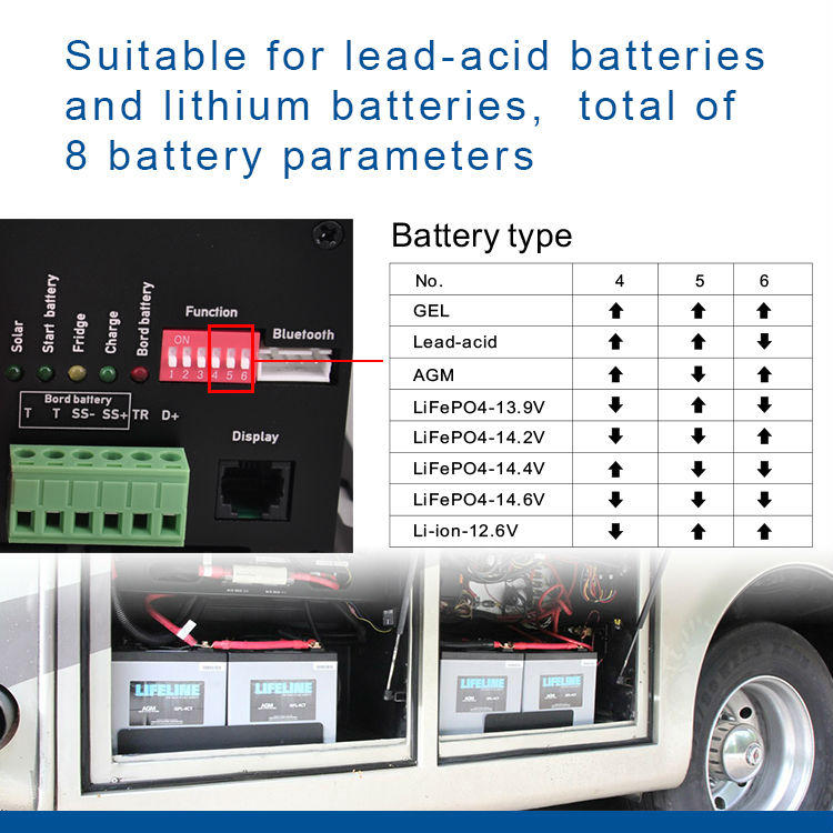 DC-DC+Solar Battery charger, with power supply interface for vehicle refrigerator , suitable for lead-acid and lithium batteries, Bluetooth, Free APP and Monitor,